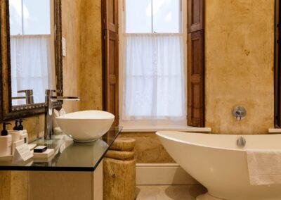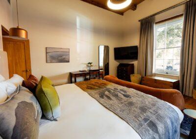 This room carries the character of the original building, where modern touches meet classic architectural details. Natural light brightens the space, and a spacious bathroom with separate bath and walk-in shower. Located within the hotel’s original wing, it sits adjacent to the shared spaces of the building.